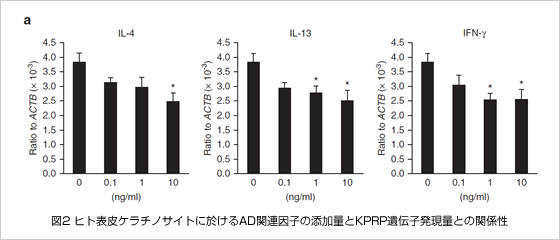 健常人とAD患者の皮膚にてKPRPの発現を確認したところ、AD罹患部位では有意にその発現が低下していることが確認されました(図1)。発現低下の原因を探るため、AD罹患部位の炎症に関与するIL-4、IL-13、インターフェロンγ(IFNγ)をヒト表皮ケラチノサイトに添加したところ、KPRP遺伝子の濃度依存的な発現低下が確認されました(図2)。