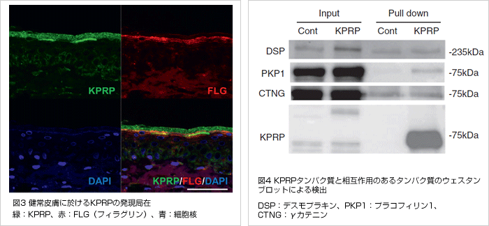 KPRPタンパク質のヒト表皮に於ける発現局在を詳細に確認したところ、角層直下の顆粒層3層構造の第2層目に一定間隔で局在することが分かりました(図3)。また、細胞内でKPRPタンパク質と相互作用のあるタンパク質を解析した結果、プラコフィリン1(PKP1)という細胞接着に関わる構成因子の1つと相互作用があることが分かりました(図4)。