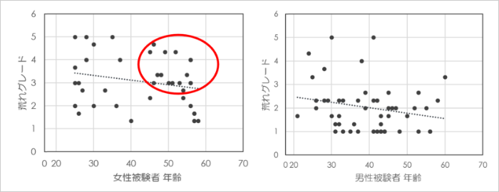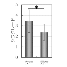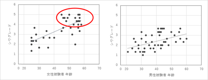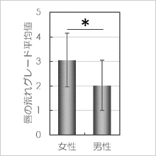 唇のシワグレード解析の結果、女性は男性と比較してシワの形成が進みやすいことが確認されました。荒れグレードを年齢、性別別にプロットした結果、特に女性は40代以上にグレード4以上の大きなシワの形成が観察されやすい傾向を認めました。