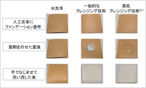 【試験方法】人工皮革にリキッドファンデーションを一定量塗布した上に、水もしくは各クレンジング製剤をのせた。指で一定回数こすって製剤をメイクに馴染ませた後、指でこすりながら温水で製剤を洗い流し、人工皮革の画像撮影を行った。