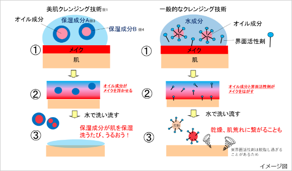 図4:美肌クレンジング技術※1と一般的なクレンジング技術のメイク落ちメカニズム