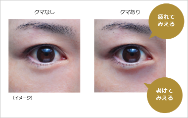 クマは目の周り、上下のまぶたやその一部が暗く見える状態です。クマは「疲れて見える」「老けてみえる」というように印象年齢を大きく左右し、性別や年代を問わず気になる目周りの悩みの一つとなっています。