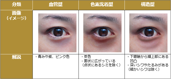 目の下から頬上部、目頭から黒目の外側までを評価範囲とし、3名の評価者が独立して色調等から「血管型」「色素沈着型」「構造型」の有無を判定、3名の評価者が「有」とした症状を「+(クマあり)」として解析しました。