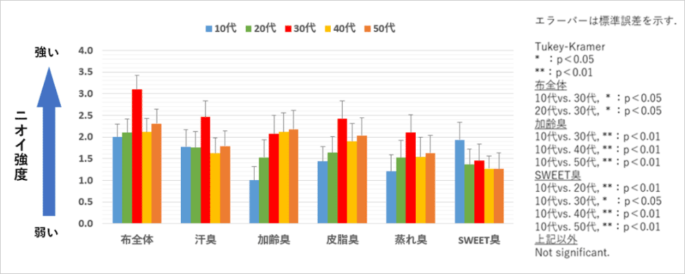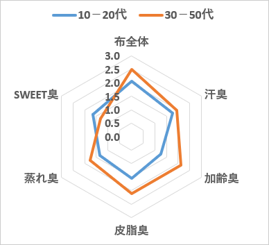 布全体の臭気強度は30代平均が最も高いスコアであり、年代間で差が見られました。また、加齢臭、SWEET臭®の項目においても年代間で差が見られました(図1)。