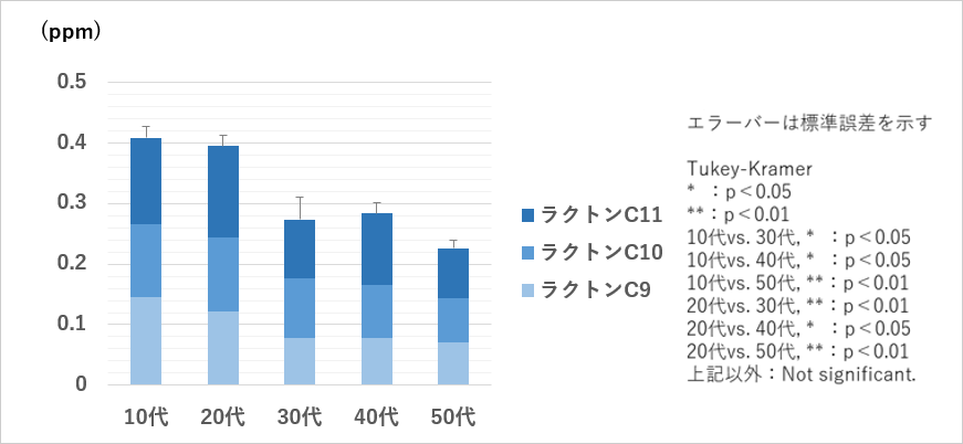 頭皮臭サンプルに対し、成分分析を行ったところ、ラクトンC9/ラクトンC10/ラクトンC11の濃度が年齢と共に減少していく傾向を示しました。また、各年代における頭皮臭中のラクトン濃度を合算したものを比較したところ、10代、20代の若年女性と、30代、40代、50代において有意差を示しました(図2)。