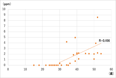 図3:年齢と頭皮臭成分中の2-ノネナール濃度の関係