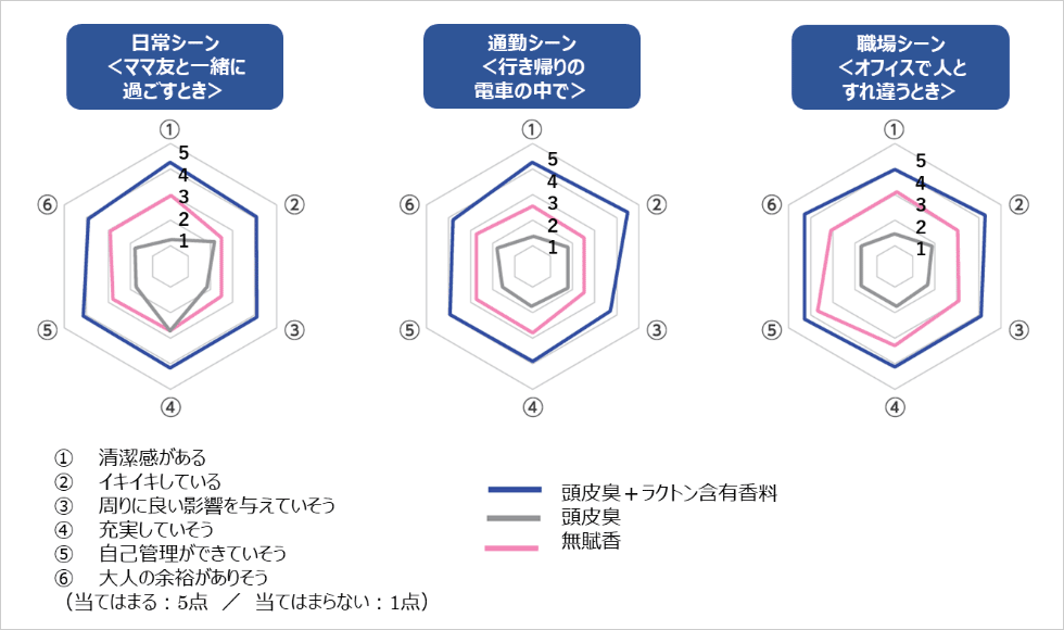 - 髪のニオイが人の印象に与える影響を調査したところ、「頭皮臭」に対し、「頭皮臭+ラクトン含有香料」で印象年齢が-1.7歳に、加えて人に好印象を与える傾向を確認した。