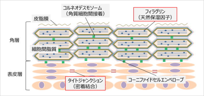 表皮バリア機能の一端を担うタイトジャンクションの形成に寄与する因子。これらの因子が細胞同士を接着させることで密着結合が形成され、バリア機能を発揮する。