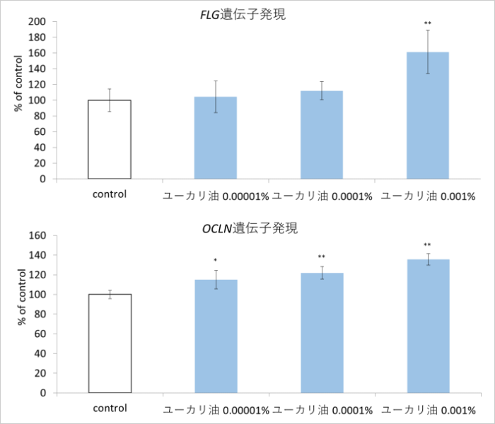 ユーカリ油はケラチノサイトのフィラグリン、オクルーディン遺伝子の発現を亢進させる(図2)