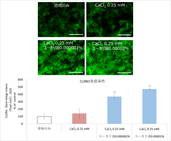ケラチノサイトに塩化カルシウム(CaCl2)並びにユーカリ油を添加し、120時間の培養後、免疫染色法を用いてCLDN1タンパク質局在並びに産生量を解析した。