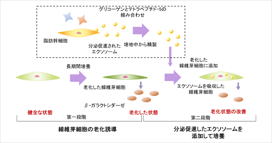 再生医療研究で注目の幹細胞エクソソームを介して線維芽細胞老化を抑制する成分(グリコーゲン/テトラペプチド-5)を発見