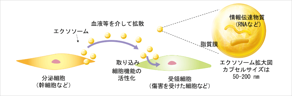 エクソソームとは、細胞から分泌されるタンパク質やRNAを内包した直径約50–200nmの細胞外小胞(カプセル)であり、細胞間における情報伝達に重要な役割を担います。エクソソームはあらゆる細胞から放出されますが、その性質はエクソソームを分泌する細胞種によって異なります。エクソソームは間葉系幹細胞を用いた細胞治療効果の中心的な役割を果たす上に、細胞外へ分泌されたエクソソームは精製・保存が可能であることから、エクソソームの活用による、迅速かつ効果的な再生医療の実現が期待されています。