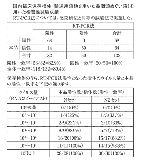 新型コロナウイルス(SARS-CoV-2)抗原迅速検査キットの国内臨床検体(鼻咽頭ぬぐい液)を用いた性能評価を実施した結果、105コピー/テスト以上を有する検体に対し良好な陽性一致率であり、また、陰性一致率は100%であったことを確認いたしました。これらより、一定の症状を有する患者等に対し、検査指針に従って陽性または陰性の確定診断を行うことの臨床的有用性を期待できるものと考えられました。