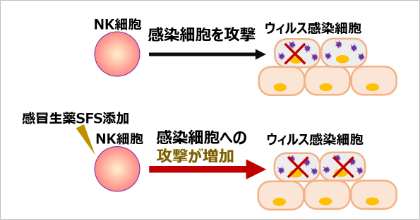 感冒生薬エキスSFSの添加により、NK細胞は活性化されて細胞傷害活性を増加させました。つまり、12種類の生薬を配合した感冒生薬エキスSFSが、体内に侵入した病原体に対する免疫機能を高める可能性が示唆されました。その作用機序の一部にNK細胞が関係することを解明しました。本研究成果を免疫機能を高めることで、感冒症状を改善する内服薬の開発へ応用していきます。