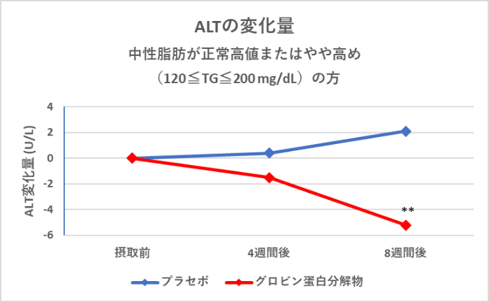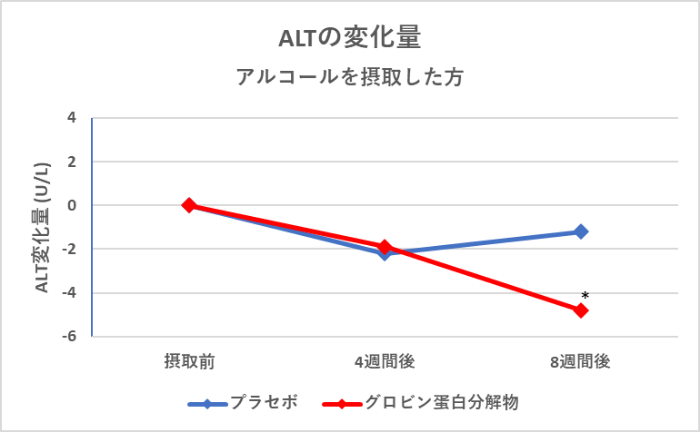 被験者背景に基づいた詳細な解析を行った結果、血中中性脂肪が高めの方において、グロビン蛋白分解物を含有した食品を摂取した群では、8週間摂取後のALT値およびAST値の低下が確認されました。また、試験期間中にアルコールを摂取した方(飲酒する方)において、グロビン蛋白分解物を含有した食品を摂取した群では、8週間摂取後のALT値の低下が確認されました。