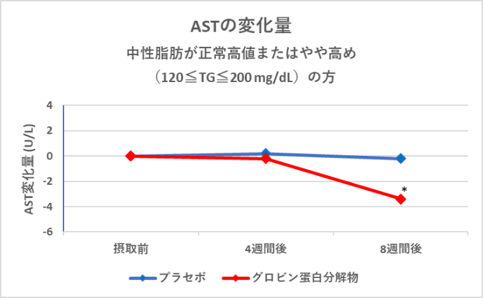 図2:血中中性脂肪が正常高値またはやや高めの方を対象としたASTの経時変化