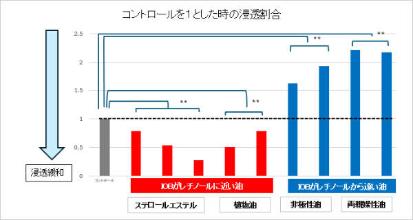 三次元人工培養皮膚モデルを用いて、成分のIOBとレチノールの浸透速度についての評価を行いました。シリコーンの浸透速度をコントロールとした場合、ステロールエステルや植物油などレチノールと極性の近い油はレチノールの浸透を緩和し、非極性油や両親媒性油などレチノールと極性の遠い油はレチノールの浸透を促進することが分かりました。以上より、油の極性、つまりIOBによってレチノールの浸透速度をコントロールできることが示されました(図2)。