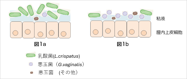図1b:乳酸菌が減少し、G. vaginalisなどの悪玉菌が増えた状態(細菌性膣炎に多い状態)の膣内フローラ