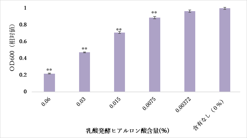 - 乳酸発酵ヒアルロン酸が濃度依存的に悪玉菌の増殖を抑制することを確認