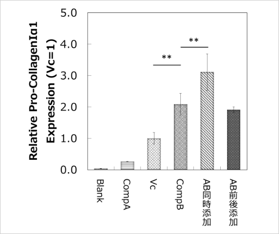 その結果、ビタミンC単独と比較して、ビタミンCとミネラルなどを含むCompBはプロコラーゲンの産生を有意に促進しました。さらに、CompAとCompBを同時に添加した条件(AB同時添加)では最も高いプロコラーゲン産生量が確認されました(図1)。