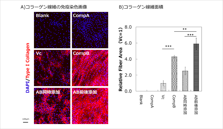 今回、アミノ酸・ペプチド(以下、CompA)と、ビタミンC、ミネラルなどを含む成分(以下、CompB)を設計しました。これらを線維芽細胞に対して同時あるいは時間差(前後添加:CompAを添加して2時間後にCompBを添加)に分けて添加する影響を、プロコラーゲン(※3)産生量およびコラーゲン線維量の2つの指標で比較評価しました。