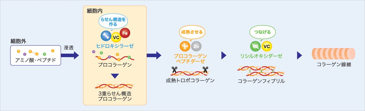 ※2 コラーゲン線維形成プロセス(図3):細胞内ではアミノ酸やペプチドを利用して、酵素(ヒドロキシラーゼ等)の働きによりプロコラーゲンを合成します。プロコラーゲンは細胞外に分泌され、不要な末端部分が切断されてトロポコラーゲンとなり、さらに架橋反応を経てコラーゲン線維へと成熟します。これらの過程には、ビタミンC、鉄、亜鉛などが酵素の補因子・活性化因子として関与します。