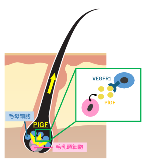 毛包の底部にある髪の形成において重要な役割を担う毛乳頭細胞でつくられます。髪のもとになる毛母細胞に存在する受容体VEGFR-1に結合することで、毛母細胞の増殖を促進し、髪の成長をサポートする因子です。