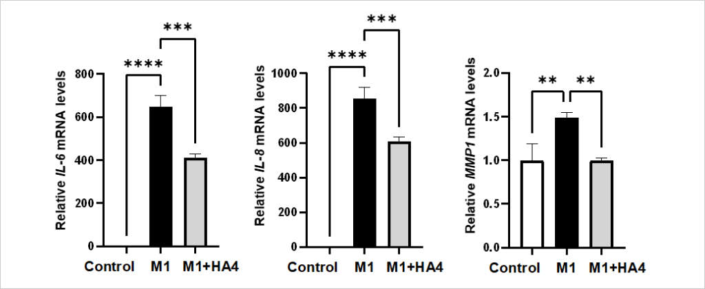 一方で、HA4処理したM1マクロファージ由来の上清(M1+HA4)を用いた場合、これらの炎症性サイトカインおよびMMP-1の発現は有意に抑制されました。(図3)