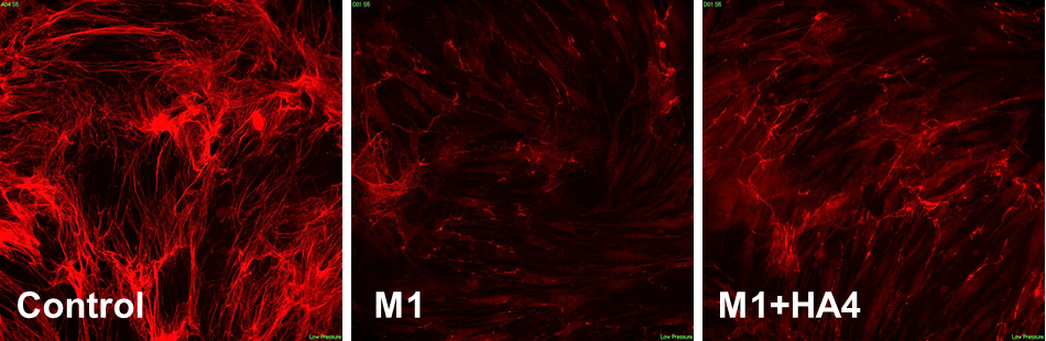 さらに、免疫蛍光染色と蛍光顕微鏡による観察の結果、通常の線維芽細胞が産生するコラーゲン線維(Control)と比較して、M1上清を添加した条件ではコラーゲン線維の量が減少していることが確認されました。一方、M1+HA4上清の条件では、コラーゲン線維の形成が改善されていることが明らかとなりました。(図4)
