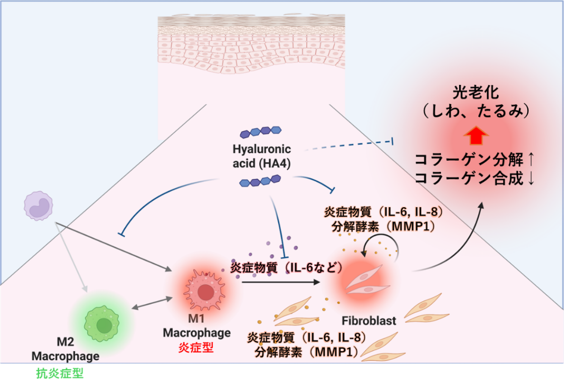 本研究では、HA4がマクロファージの分極・性質を調整することで、線維芽細胞によるコラーゲンリモデリングを間接的に改善するという新たなメカニズムに着目しました。これは、紫外線による直接的なダメージに加え、免疫細胞と線維芽細胞との間の相互作用(クロストーク)を介した老化促進のプロセスに着目した、新しいアプローチです。(図1)