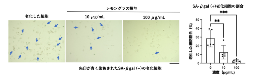 抗がん剤であるエトポシドにより、マウス由来C2C12筋芽細胞を老化誘導させた(Nature. 2023;613:168-178)。同時にレモングラスのエタノール抽出物を3日間暴露させ、SA-βgal染色を実施した。得られた顕微鏡画像から青く染色された細胞数の割合(%)を計測した。統計解析は一元配置分散分析を用いて有意差(**p < 0.01, ****p < 0.001)を算出した。(三重大学実施)