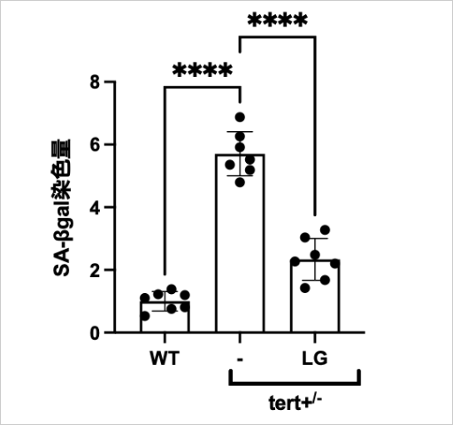 テロメラーゼ転写酵素遺伝子(tert)のヘテロ欠損ゼブラフィッシュは老化が促進する(Aging cell. 2025;e7007)。この個体に対し、レモングラス葉抽出物(LG)を飼育水懸濁(50μg/mL)にて投与し、SA-βgal染色を実施した。得られた顕微鏡画像からImageJソフトウェアを用いて青く染色された領域の強度(濃さ)を定量した。実験に使用した個体数は各群7匹、野生型群(WT)との比較で数値化した。統計解析は一元配置分散分析を用いて有意差(****p < 0.001)を算出した。(三重大学実施)