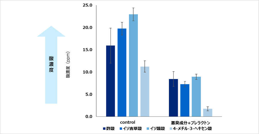 結果1:悪臭成分の酸にプレラクトンを添加すると各酸の量が減少することを発見