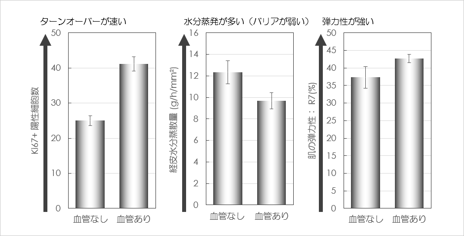 血管を含まない従来型人工皮膚と、血管付属人工皮膚を構築し、表皮ターンオーバー、バリア機能、真皮弾力性について解析した。表皮ターンオーバーは免疫組織学的解析法を用いてKi67陽性表皮基底細胞数をカウントした。経皮水分蒸散量はTewameter TM HEXを用いて測定した。肌の弾力性については、Cutometer MPA 580を用いてR7値を測定した(ロート製薬研究所実施)。