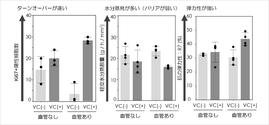 血管を含まない従来型人工皮膚と、血管付属人工皮膚を構築し、ビタミンCを含む、または含まない培養液を用いて一定期間培養した後に、表皮ターンオーバー、バリア機能、真皮弾力性について解析した。表皮ターンオーバーは免疫組織学的解析法を用いてKi67陽性表皮基底細胞数をカウントした。経皮水分蒸散量はTewameter TM HEXを用いて測定した。肌の弾力性については、Cutometer MPA 580を用いてR7値を測定した(ロート製薬研究所実施)。