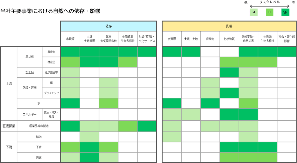 当社グループは、事業活動がサプライチェーン全体を通じて、自然資本に依存し、また影響を及ぼしていることを認識しています。TNFDが推奨するリスク評価ツール「ENCORE」を用い、主要事業である医薬品および化粧品関連のバリューチェーンにおいて、上流(原料調達等)、直接操業、下流(廃棄・流通)それぞれの自然資本との関係を整理し、自然への依存および影響の両面から重要な要素を特定しました。