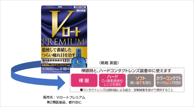 そこで、「Vロートプレミアム」シリーズ目薬や「ロートクリア」の紙箱に、裸眼の時やコンタクトの種類ごとに点眼可否の表示を記載するようにしました。