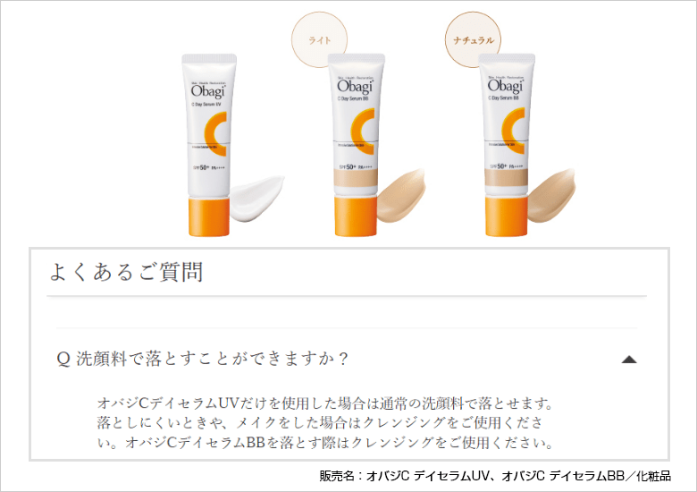 商品名:オバジC デイセラムUV、オバジC デイセラムBB「洗顔料で落とすことができますか?」をブランドサイトの【よくあるご質問】に公開しました お寄せいただいたご意見 石鹸で落ちますか?それともオイルクレンジングなどが必要でしょうか?落とし方も重要だと思うので、サイトなどにも載せてほしいです。 50代女性のお客様 化粧をせずにオバジCデイセラムUVだけで過ごした場合、石鹸だけで落とせますか? 30代女性のお客様 「落とし方」に関するお問合せをお客様から多数いただいたため、オバジ ブランドサイトの【よくあるご質問】に「洗顔料で落とすことができますか?」を新たに公開しました。 お客様からのお声を参考に、さらなる情報提供に努めてまいります。 ※2025年時点の活用事例です。リニューアル等によりデザインや表記が変更になることがあります。 一覧へ 前のページへ 次のページへ