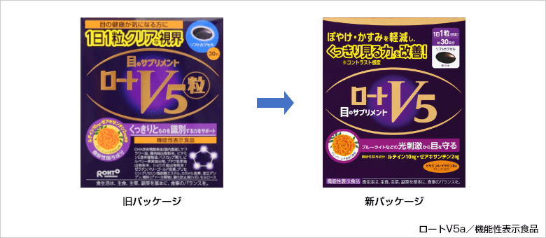商品名:ロートV5摂取目安量を誤解されにくい製品名に変更しました お寄せいただいたご意見 「ロートV5粒」と書かれているが1日5粒飲むということですか? 80代 女性 パウチのおもて面には「5粒」と書いていて、裏面には「1日1粒を目安」と書いている。1日何粒飲めばいいですか? 70代 男性 『ロートV5粒』という製品名から、1日当たりの摂取目安量を1日5粒と誤解されることがありました。このたびのリニューアルで『ロートV5a』に製品名を変更し、誤解を生まないように工夫しました。今後もお客様からの声を反映し、より分かりやすくお伝えできるよう努めてまいります。 ※2025年時点の活用事例です。リニューアル等によりデザインや表記が変更になることがあります。 一覧へ 前のページへ 次のページへ